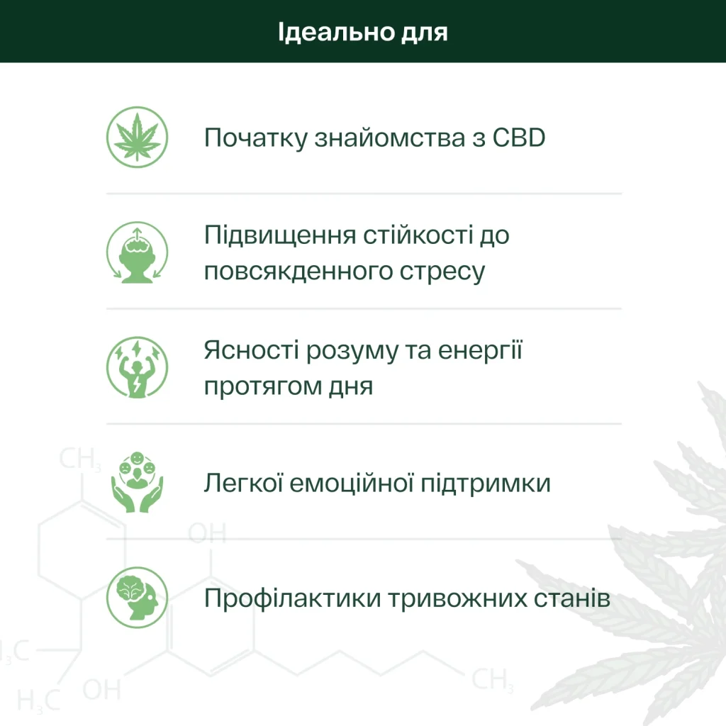Олія КБД 500 мг підійде тим, хто страждає від тривожності, стресу, періодичного болю, спричиненого хронічними захворюваннями або перенапруженням унаслідок фізичного навантаження.